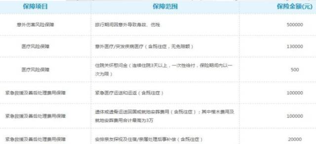 保险内容应包含旅游伤害、突发疾病医疗及善后费用,其中“因意外事故死亡”最低保险金额须为新台币二百万元(或人民币五十万元),“因意外事故所致体伤及突发疾病所产生的医疗费用”最低保险金额须为新台币五十万元(或人民币十二万五千元),其投保期间应包含核准来台停留期间。