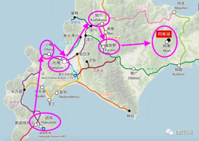 整个区域很大,从下往上的主要住宿城市,包括函馆、札幌、小樽、旭川、富良野、阿寒湖等,大家可根据季节和自己的观赏目的选择!